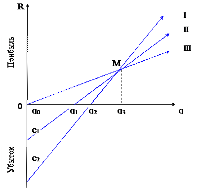 R – прибыль; с – постоянные затраты; I, II, III – варианты производства;
