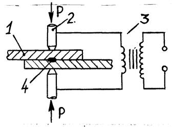 собирают внахлестку и помещает между электродами 2 точечной машины. Затем детали сжимают электродами с усилием Р и по вторичной цепи пропускают электрический ток с помощью контактного трансформатора 3. При этом в деталях и в контакте между ними выделяется большое количество тепла, достаточное для расплавления части металла и образования сварной точки (ядра) 4 при последующем охлаждении.
