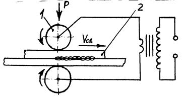 Принципиальная схема шовной сварки показана на рис.3. Физическая сущность процесса образования сварной точки при сварке деталей этим способом аналогична точечной сварке. Отличие состоит в том, что применяют роликовые вращающиеся электроды 1, между которыми непрерывно с постоянной скоростью движутся свариваемые детали 2.