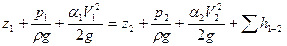Для двух сечений потока 1-1 и 2-2 реальной жидкости при установившемся движении уравнение Бернулли имеет вид