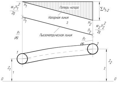 Графическая иллюстрация уравнения Бернулли показана на рис.1.1. Линия показывает изменение полных напоров в сечениях 1-1 и 2-2 и называется напорной линией,