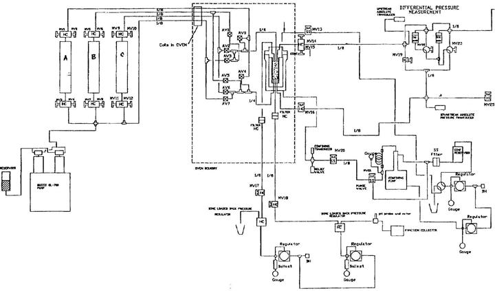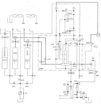4 Отметить дифференциальные давления, скорость потока и совокупный введенный объем. Измерить дифференциальные давления поперек различных образцов керна (1, 2, 3), открывая клапаны AV10 и AV11. При этом фиксируются и заносятся в память ПЭВМ коэффициенты проницаемости для одного, двух и трех образцов, как функции скорости потока, дифференциального давления и расстояния по керну.