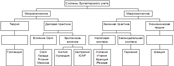 Другая интересная модель, в которой типизация осуществляется не только путем выделения характерных типов и черт, но и их иерархическим подчинением друг другу, приведена на рис. 1. Верхний уровень иерархии определяет то, на какие экономические цели ориентируется учетная система страны - макро- или микроэкономические. Потом осуществляется градация в зависимости от того, на что ориентируется страна в построении системы учета - на теоретические разработки, или на практические потребности либо делового мира, либо законодательства. Наконец, в системах, ориентированных на практику, можно осуществить деление по тому, как осуществляется регулирование - при помощи законодательства (Британская система и Германия), или основную роль играют подзаконные акты. В макроэкономической ветви это прежде всего особенности налогообложения, а в американской - постановления частных организаций.