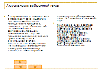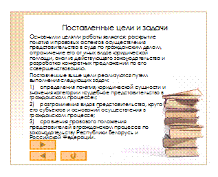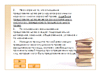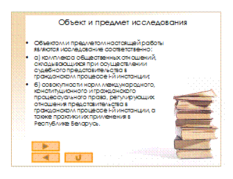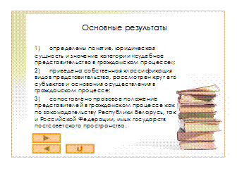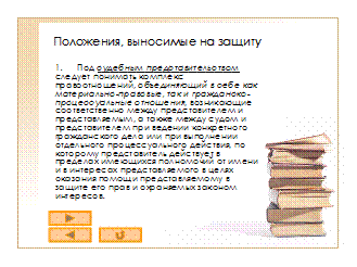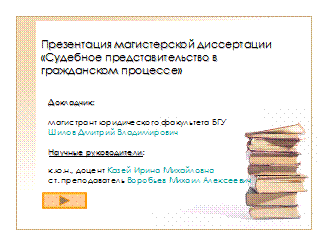 Презентацию, выполненную в MS Power Point, можно посмотреть по следующей ссылке: презентация магистерской диссертации на тему «Судебное представительство в гражданском процессе».