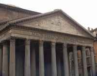 На фронтоне уцелела надпись: “М. Агриппа в свое третье консульство соорудил” (то есть в 27 г. до н.э.). Высота колонн около 13 м. В 125 году было закончено сооружение Пантеона. Пантеон — “храм всех богов” — был в 27 году до н.э. построен консулом Агриппой, зятем Августа, но сгорел вскоре после постройки и затем неоднократно перестраивался. В 110 году при большом пожаре Рима Пантеон опять сгорел и был заново возведен Адрианом на старом фундаменте. Следующая часть, круглое здание (ротонда) около 45 м диаметром и высотой, реставрировано Адрианом, Септимием Севером и Каракаллой — из кирпича, богато отделанного белым и цветным мрамором и золоченой бронзой (кровля), с наборным, штучным полом из цветного мрамора. Пантеон (храм всех богов) в основе своего плана имеет круг. Массивные цилиндрические стены, облегчены за счет устроенных в их толще парадных ниш, служивших в древнеримское время алтарями. На верхнюю часть краями опирается гигантский купол, своим пролетом (43 м.) перекрывающий без единой опоры все внутреннее пространство. В самом центре купола имеется небольшое круглое отверстие для освещения внутренности храма. Постройка Пантеона датирована 125 г. н.э., а его купол, изготовленный из бетона и кирпича, до сих пор считается настоящим архитектурно-инженерным шедевром. Подобно остальным римским храмам, Пантеон был богато украшен и производил своим монументальным величием неизгладимое впечатление на видевших его людей разных эпох.