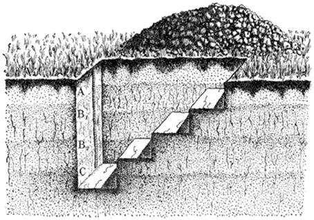На выбранном участке местности копают почвенный разрез так, чтобы три стенки его были отвесными, а четвертая спускалась ступеньками (рис. 1).