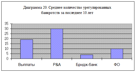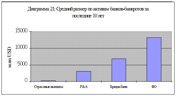 Следующая диаграмма сравнивает практический опыт применения различных методов урегулирования несостоятельности банков за последние 10 лет. По частоте использования на первом месте находится метод продажи активов и передачи обязательств (P&A), на втором – выплата страхового возмещения с последующей ликвидацией банка. Средний размер активов при использовании метода оказания прямой финансовой помощи (ФО) был наибольшим, за ним следует метод бридж-банка. По продолжительности во времени на первом месте, как самый длительный метод, бридж-банки. Из анализа следует, что большинство стран прибегают к методу P&A для урегулирования банкротств крупных банков, и этот метод был наиболее быстрым с точки зрения сроков урегулирования. Метод ФО использовался преимущественно при банкротствах очень крупных банков, тогда как выплата страхового возмещения с последующей ликвидацией – при урегулировании несостоятельности относительно мелких банков. В связи с этим, страховщик депозитов должен иметь в наличии четкие правила и процедуры (включая ограничения по срокам) для применения тех или иных методов урегулирования (диаграммы 21 и 22).