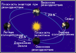 рад/с, что примерно соответствует периоду в 23 ч 56 мин 4,1 с. Ось вращения наклонена к плоскости эклиптики под углом 66° 33' 39'' (около 23°26' наклон между экваториальной плоскостью и эклиптикой принят с 1 января 1983 года, когда наклон уменьшился до 23° 26' 29". Влияние прецессии и нутации приводит к его изменению в пределах от 21°55' до 24°18'). Этот наклон и годовое обращение Земли вокруг Солнца обуславливают исключительно важную для климата Земли смену времен года, а собственное ее вращение-смену дня и ночи. Вращение Земли из-за приливных воздействий неуклонно (хотя и очень медленно на 0,0015 секунды за столетие) замедляется. Имеются и небольшие нерегулярные вариации продолжительности суток. Положение географических полюсов меняется с периодом 434 суток с амплитудой 0,36''. Кроме того, имеются и небольшие сезонные их перемещения.