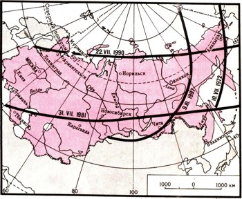 За последние 20 лет полное солнечное затмение посещало Россию трижды: 31 июля 1981 года – полоса прошла по югу Сибири, 22 июля 1990 года – лунная тень очертила побережье Северного Ледовитого океана, захватив Таймыр и Чукотку и Следующее будет 1 августа 2008 года – тень пробежит по Западной Сибири.