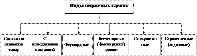 Товарные биржи реализуют биржевые товары - однородную, стандартизированную продукцию типа зерна, нефти и т.д. Купля-продажа товаров, т.е. сделки на реальный товар, может осуществляться с немедленной их поставкой в будущем (форвардные сделки) (см.рис.2), однако большую часть сделок на современных товарных биржах составляют т.н. фьючерсные сделки.