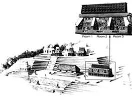 Древние сооружения майя воздвигались на искусственных возвышениях (стилобатах), форма и высота которых определялась назначением поддерживаемых зданий. Первый тип сооружений — четырехгранные ступенчатые пирамиды (разнообразные по высоте и числу уступов), на усеченной вершине которых находился небольшой храм с одним или тремя помещениями. От подножия пирамиды к двери святилища шла крутая лестница; у больших пирамид лестницы устраивались иногда по всем четырем сторонам. Великий город Паленке был первым городом классического периода, о котором стало известно в Европе. Его развалины среди густой тропической растительности были издавна знакомы местным индейцам, называвшим их На-Чан. Великий город пришел в запустение задолго до того, как на американский континент высадились первые европейцы. Впереди на вершине «акрополя» с крутыми склонами стоит большой дворец. Склоны эти местами обвалились и обнажили отверстия нескольких подземных ходов. У юго-западного угла «акрополя» на ступенчатой пирамиде возвышает ся здание с высоким сводчатым перекрытием. Это Храм Надписей, который так был назван потому, что в нем нашли плиту с длинной надписью из 620 иероглифов. Вокруг дворца кроме Храма Солнца и Храма Надписей имеются и другие— Храм Креста, Храм Льва, сложенные из белого камня. Дворец имеет не только башню, но и подземелье. Повсюду — на стенах, потолке, колоннах, в нишах и ступенях лестниц сохранились остатки великолепных барельефов и фресок.