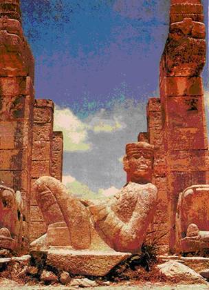 Недалеко от главной площади города находилось несколько каменных мужских фигур, лежащих на спине, с поднятыми над головой коленями, так называемых Чакмоолов — божеств, связанных с культом воды. На животе у них высечены чашевидные углубления для жертвенной крови. Археологами сделан вывод, что все эти «новшества» — неизгладимый след вторжения тольтекских племен, которые захватили город примерно в X в. В священной книге майя «Чи-лам-Балам» также даны подробные описания чужеземцев и столицы, которую они основали в Чичен-Ице. Сообщается, что «ицы» пришли сначала из далекого Толлана и что создателями этого города были тольтеки. Действительно, археологами было обнаружено много общего между культурой Чичен-Ица и городом Тулой в долине Мехико, который и является древним Толланом. В Туле были найдены фигуры воинов, которые украшали и Чичен-Ицу. А на стенах пирамид Тулы — фрески, до мельчайших деталей совпадающие с юкатанскими. Они изображали ягуаров, стервятников, пожирающих человеческие сердца. Были в Туле точные копии колонн Чи-чен-Ицы, у основания одной из пирамид — статуя полулежащего на спине Чакмоола. Оба города разделяло 800 миль труднопроходимых джунглей. Любопытным памятником культуры майя был Священный Колодец, или Колодец Жертв, в Чичен-Ице. Он был 20 м глубиной до воды, пласт воды достигал 10 м, ширина колодца — 60 м. У индейцев существовала легенда, что тут приносились в жертву самые красивые девушки. Жертвоприношения делались, когда возникала крайняя надобность в дожде. Считалось, что девушки могут выпросить у богов счастливый год, так как в колодце жил Бог Дождя. Из самых далеких уголков страны ежегодно к колодцу шли паломники, чтобы бросить свои дары богу Чаку — покровителю земледельцев. Главный храм в Чичен-Ице посвящен Богу Ветра Кукулькану, одному из главных в пантеоне майя. Он изображался в виде пернатого змея. Храм обращен фасадом к колодцу и соединен с ним особой «Дорогой Жертв», выложенной каменными плитами. Испанские историки XVI в. сообщают, что сам город к моменту их прихода был уже мертв, но жертвоприношения людей продолжали осуществляться.