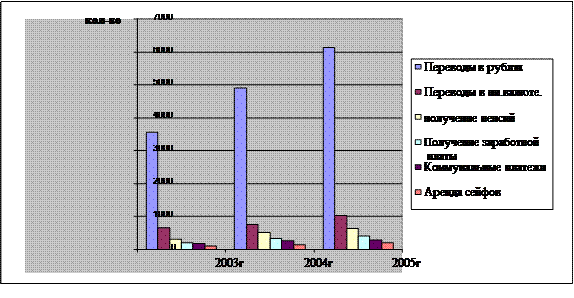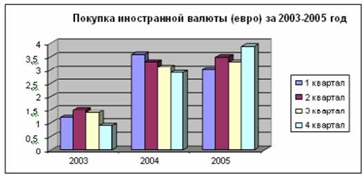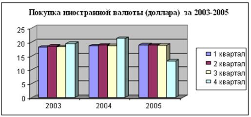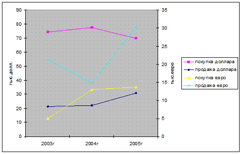Вторая глава «Анализ валютно-обменных операций, проводимых Тверским отделением Сберегательного банка г. Москвы» посвящена рассмотрению валютно-обменных операций в банке. Здесь описаны услуги по валютно-обменным операциям Тверского отделения Сбербанка РФ, проведен анализ динамики купли-продажи валюты за 2003-2005 годы по кварталам. Также рассмотрена автоматизированная банковская система «Кворум», позволяющая автоматизировать как работу кассиров обменных пунктов, так и отдела валютно-обменных операций банка.
