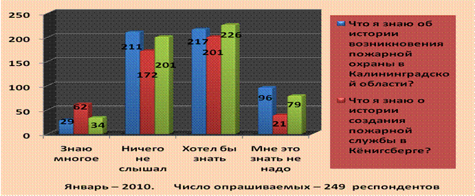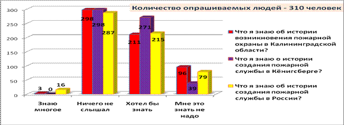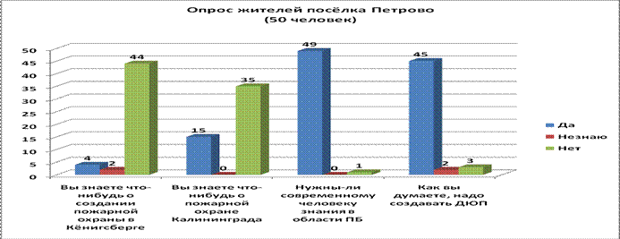 Учителями школы, членами ДЮП постоянно проведятся уроки безопасности в школе, лагерях, ДОУ и других ОУ района и области, на которых мы рассказываем о том, какие действия необходимо предпринимать в случае пожара, а вот вопрос о развитии пожарной охраны в Восточной Пруссии завёл всех в тупик. На занятиях в кружке «Юный пожарный» мы уже познакомились с историей противопожарной службы России, а о истории создания пожарной охраны Кёнигсберга и Калининграда мы знали катастрофически мало. Тогда мы решили провести анкетирование и тестирование во всех классах школы на темы «Что я знаю об истории создания пожарной охраны Кёнигсберга и Калининграда?», «Значимость противопожарной службы, уроков ОБЖ, физической культуры, занятий в ДЮП». Провели соцопрос среди жителей близлежащих посёлков. Результаты оказались неутешительными (приложение № 1).