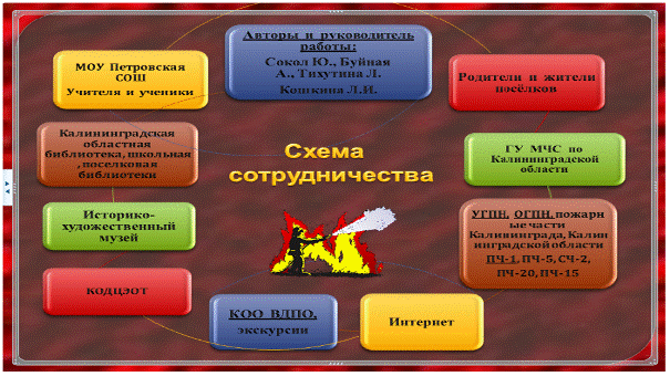 3. Сотрудничество руководителя проекта, учеников, членов дружины юных пожарных «Спасатели», родителей, сотрудников Калининградского областного отделения «Всероссийское добровольное пожарное общество», ГУ МЧС РФ по Калининградской области, государственного пожарного надзора региона, всех пожарных г. Калининграда и области.