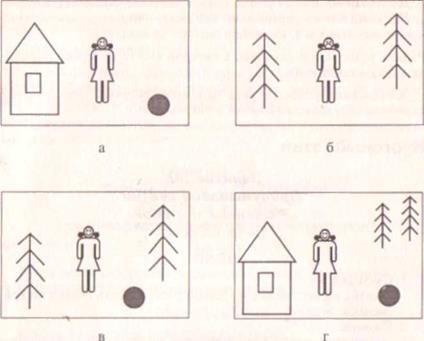 Воспитатель. Сегодня мы будем придумывать сказку на тему «Как щенок Машеньку спас». Помогут вам в этом карточки-схемы, в которых сказка записана специальными знаками: елка обозначает лес, темно-серый круг — щенка, схема дома, фигура девочки (рис. 7).