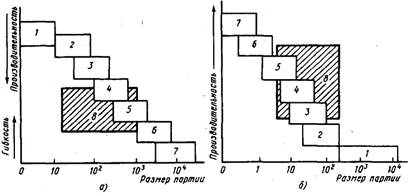 а — размера партии; б — числа наименований обрабатываемых деталей; 1 — универсальные станки с ручным управлением; 2 — операционные станки с программным управлением; 3 — обрабатывающие центры; 4 — РТК я ГПМ; 6 — ГАУ; 6 — ГАЛ; ГАЦ; вводы; 7— автоматические линии; 8 — ГПС