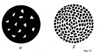 Рассмотрим в качестве примера организацию поисковой беседы при изучении строения вещества в VII классе. Учитель обращается к ученикам: «У меня на столе вы видите различные тела: кусок свинца, железный шарик, подвешенный на цепочке, воду в колбе, а в этом стеклянном цилиндре под поршнем тоже физическое тело — воздух. Давайте попробуем ответить на вопрос: эти тела заполнены полностью своим веществом (свинцом, железом, водой, воздухом) или они пористы, т. е. в заполняющем их веществе имеются какие-либо промежутки?» Учащиеся дают такие ответы: «В воздухе есть промежутки, а в сплошных телах (в остальных трех) промежутков нет», «В твердых телах, например в свинце, тоже могут быть промежутки, но если свинец расплавить, то после затвердевания никаких промежутков в теле не будет». Учитель предлагает обосновать высказываемые соображения или предложить способы их опытной проверки. Если учащиеся затрудняются, учитель демонстрирует такие опыты, как сжатие воздуха поршнем в цилиндре, уменьшение объёма свинца (образование вмятины в куске свинца при ударе молотком), расширение воды в колбе при нагревании. После каждого опыта учащимся предлагают самостоятельно сделать вывод о том, дает ли данный опыт какие-либо основания для решения поставленного вопроса. Анализ этих опытов приводит учащихся к убеждению, что тела не сплошь заполнены веществом, а в них имеются промежутки, которые при увеличении объема тела увеличиваются, а при уменьшении — уменьшаются. Учитель спрашивает: «Что же представляют собой промежутки внутри тел? Может быть, они подобны полостям в куске сыра, а остальная часть тел все же сплошная? Или это промежутки между отдельными мельчайшими частицами вещества? Тогда тело должно состоять из множества частичек, расположенных на некоторых расстояниях друг от друга?» (Вывешивает рисунок 17, а и б, сделанный на листе бумаги.) Обычно учащиеся отвечают, что если бы тела состояли из отдельных частичек, то они рассыпались бы; следовательно, правильным является первое предположение. Учитель не торопится их переубедить. «Опыт показывает,— говорит он,— что любые (даже самые малые) тела при охлаждении или под давлением уменьшаются. Подумайте, при каком строении тела это возможно». И учащиеся приходят к выводу, что уменьшение объема тела возможно только при его зернистом строении (рис. 17,6).