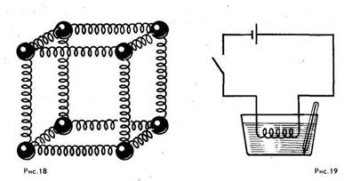 Смысл противоречия учащиеся улавливают быстро, а разрешить его самостоятельно обычно не могут. Вновь возникает проблемная ситуация. Учитель усиливает ее: «Молекулы не только не сближаются вплотную, но и как будто даже сопротивляются попыткам сближения. Это мы хорошо ощущаем, пытаясь сжать резиновый шарик или любой другой предмет. Чем же объяснить, что для сжатия тел, т. е. для уменьшения расстояний между молекулами, необходимо прикладывать внешнюю силу, и тем большую, чем сильнее мы пытаемся сжать тело?» Здесь учащиеся обычно не очень уверенно высказывают предположение, что при сближении молекул между ними возникают силы отталкивания. Учитель продолжает: «Итак, мы приходим к выводу, что между молекулами на малых расстояниях в одних случаях действуют силы притяжения (при попытках удалить молекулы друг от друга), в других — силы отталкивания (при попытках приблизить молекулы друг к другу). На первый взгляд это может показаться странным, но представим себе такую модель. (Вывешивает сделанный на листе бумаги рисунок 18.) В вершинах куба на пружинах закреплены шарики. Если растягивать этот куб, то возникнут силы притяжения между шариками, если же сжимать — силы отталкивания. И мы не удивимся этому. При взаимодействии молекул наблюдается похожая картина. Только не нужно думать, что молекулы в телах соединены какими-то пружинами. Между молекулами действуют особые силы, называемые электромагнитными. Подробно об этих силах вы узнаете в старших классах». Затем учащиеся с помощью учителя делают промежуточный вывод: молекулы не сплошь заполняют тела — между ними имеются промежутки; между молекулами на очень малых расстояниях действуют силы притяжения и силы отталкивания; наличием этих сил и объясняются многие из рассмотренных явлений, например склеивание и сваривание тел, возникновение сил сопротивления сжатию и растяжению тел и т. д. Так постепенно, решая выдвигаемые учителем проблемы или те, которые возникают в ходе обсуждения, ученики осознанно усваивают материал темы «Первоначальные сведения о строении вещества».