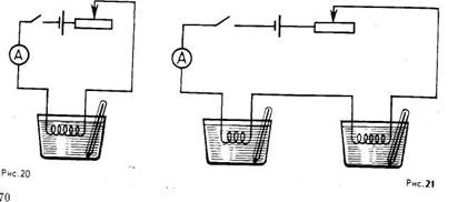 При обсуждении первого условия — сила тока в обоих опытах должна быть одинакова — естественно, возникает вопрос: будет ли одинакова сила тока, если пользоваться установкой, соответствующей предложенной схеме? Сообразив, что при замене спирали сила тока изменится, учащиеся находят новое решение: в цепь необходимо включить амперметр и реостат для регулирования силы тока (рис. 20).