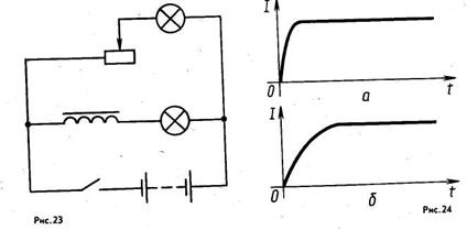 Из жизненной практики с явлением самоиндукции учащиеся незнакомы, хотя некоторые из них видели, как иногда при размыкании электрической цепи в воздушном промежутке между контактами рубильника вспыхивает искра. Поэтому для проблемного изучения явления самоиндукции необходим опорный эксперимент, в котором бы проступала основная особенность явления. Им может быть известный опыт с самоиндукцией при замыкании электрической цепи (рис. 23).