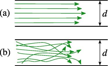 Схематичное изображение ламинарного (a) и турбулентного (b) течения в плоском слое