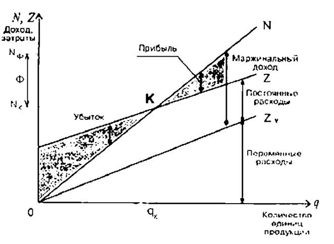 Слева от критической точки заштрихована область убытков, которая образуется в результате превышения величины постоянных расходов над величиной маржинального дохода.