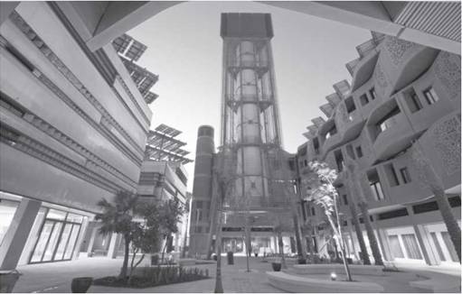 Примером такого подхода к созданию пространства современного города может служить город Масдар в Эмиратах, здесь архитекторы опираются на исторические постройки в части материала, цветовых характеристик, декора и конфигураций, призванных бороться с негативным влиянием пустыни, а технологическая начинка его «городских интерьеров» создает необходимый комфорт, невозможный при чисто традиционном подходе, не подкрепленном новыми технологиями (рис. 5).
