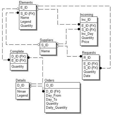 Реализация проекта представляет собой базу данных (логическая схема данных приведена на рис. 11) и клиент-серверное компьютерное приложение, которые в совокупности представляют собой автоматизированную программу расчета (АПР). В этой программе из описанных в физической модели процессов реализованы следующие: «Режим «Закупки», «Режим «Текущее состояние», «Определение количества денег»,»Оформление заявки», «Определение количества комплектующих», «Заявка на производство», «Определение количества готовой продукции», «Заявка на продажу».