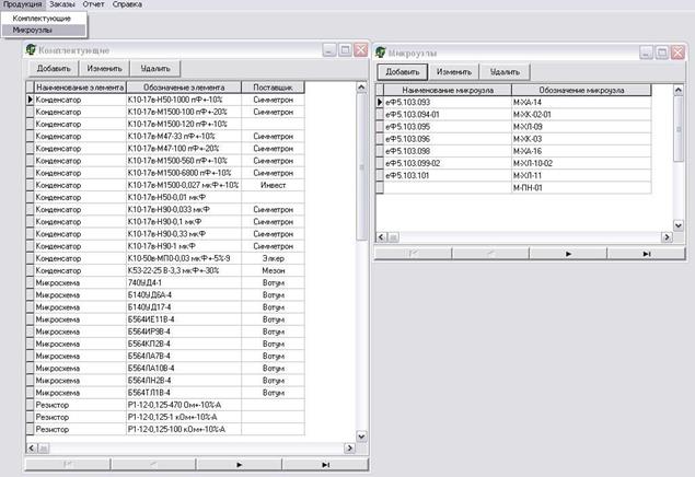 Управление приложением осуществляется при помощи главного меню программы, содержащего основные функции системы, а именно: просмотр перечня имеющихся на складе комплектующих ЭРЭ и изготавливаемых микроузлов, а также ввод и редактирование информации в базе данных складских запасов; предоставление отчетов о дефиците комплектующих ЭРЭ, о финансовых затратах на приобретение необходимых ЭРЭ; оформление поставок ЭРЭ, заказов на изготовление микроузлов и заявок на обеспечение покрытия дефицита; расчет дневной нормы выпуска микроузлов для выполнения соответствующего заказа.