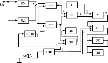 РПП – регулятор порога переключения; СТ ЗЗ – счётчик задержки запуска; СТ ЦЗ – счётчик цифровой задержки; УУ – устройство управления; ЦИ – цифровой индикатор