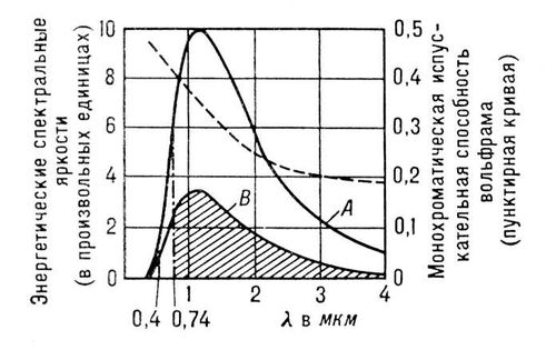 Рис. 6. Кривые излучения абсолютно чёрного тела A и вольфрама B при температуре 2450 К. Заштрихованная часть — излучение вольфрама в инфракрасной области; интервал 0,4—0,74 мкм — видимая область.