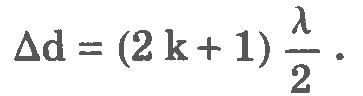 Если дельта d равна нечетному числу длин полуволн, то при сложении волн гребень одной волны будет накладываться на впадину другой, поэтому волны будут максимально ослаблять друг друга