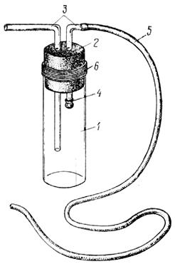 3 – стеклянные трубки; 4 – фильтр; 5 –резиновая трубка; 6 – кольцо из лейкопластыря или липкой ленты