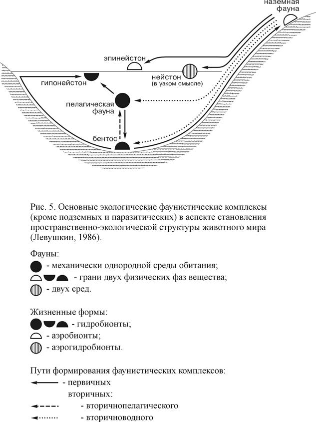 Характеристикой нейстона мы заканчиваем выделение фаун, связанных с водной средой. В заключение этого раздела приводим основные экологические фаунистические комплексы (кроме подземных и паразитических) в аспекте становления пространственно-экологической структуры животного мира (рис. 5).