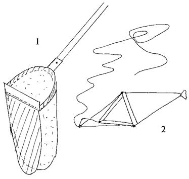, осуществляют при помощи скребков, драг, дночерпателей (рис. 7, 8). Скребок представляет собой разновидность сачка, только с нижней стороны под углом 45 прикрепляется металлический нож шириной 3 см, длиной 13-20 см. К ободу пришивается мешок из газа (глубиной 50-70 см) и брезентовая половина мешка (для предохранения газового мешка).