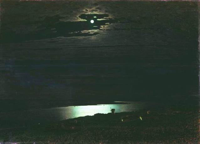 Ему удается такое соединение красок, которое в картине, при темных тонах берегов и неба, создает ощущение свечения Луны. Лунным светом залитый берег он писал не однажды. (Можно показать ранние картины). Теперь написал Луну! Обычно у живописцев она остается за краем картины или задрапирована облаками. Куинджи написал ее в тот момент, когда ненадолго рассеялись облака.