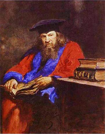 Рядом портрет Репина. Пожилой седовласый человек. Во взгляде усталость от знаний о мире и понимание его непознаваемости. Руки, много работавшего человека держат фалиант древнего философа, чья созерцательность и знание мира светится в лице великого ученого. Жизненная усталость и согбенность Дмитрия Ивановича не от несостоятельности, а от груза понимания, груза открытий, которые делают человека счастливым, но и приводят к скептицизму.