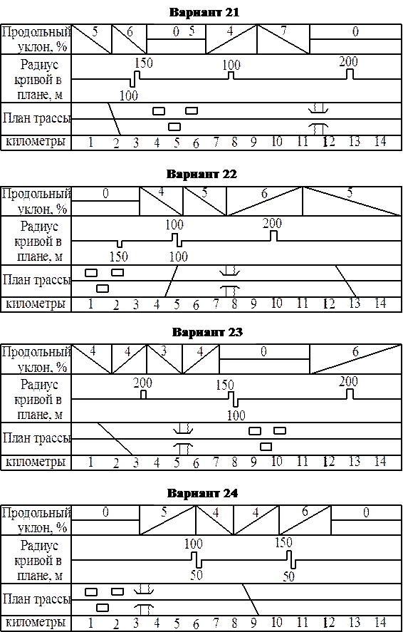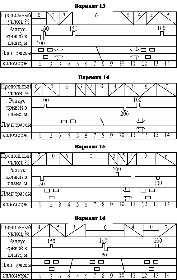 Задание на курсовое проектирование выдается преподавателем индивидуально каждому студенту по номеру студента в списке группы в виде плана трассы с указанием ширины проезжей части, количества полос движения, ширины обочин, величин продольных уклонов, радиусов кривых в плане, интенсивности движения на главной и пересекающих дорогах, длины населенного пункта, длины участков на подходах к населенным пунктам, расстояния от застройки до проезжей части, коэффициента сцепления, приведенных в Приложении Д. Протяженность участка дороги 15 км для всех вариантов.