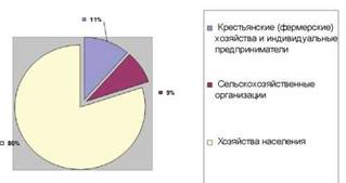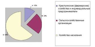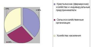 Как свидетельствуют данные рис. 1, в структуре произведенной сельскохозяйственной продукции доля животноводческой продукции в целом по району за 2011 год составила 36%, соответственно на долю продукции растениеводства приходилось 64%. При этом необходимо подчеркнуть, что в целом по району в структуре численности крупного и мелкого скота 41% приходится на крестьянские (фермерские) хозяйства.