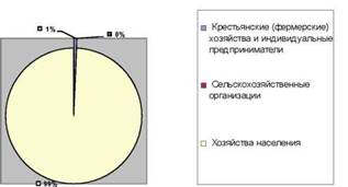 Практически вся доля в структуре свиноводческой отрасли района, как наглядно показывают данные рис. 5, находится «в руках» личного подворья - 99%, соответственно на долю крестьянских (фермерских) хозяйств и индивидуальных предпринимателей приходится всего 1%. Здесь приходится, к сожалению, констатировать, что свиноводческая отрасль не нашла свое развитие в сельскохозяйственных организациях, но данное явление объясняется прежде всего тем, что в республике спросом в первую очередь пользуется скотоводческая продукция и каждый субъект хозяйствования ведет конкурентную борьбу за место на рынке для осуществления своей дальнейшей финансово-хозяйственной деятельности.