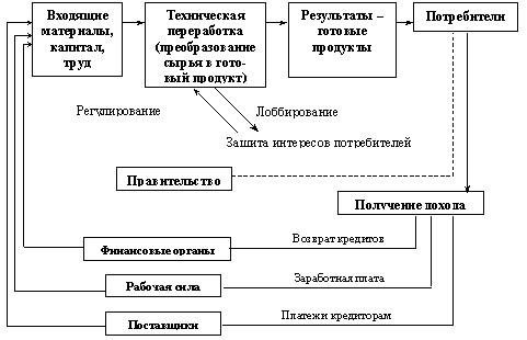 На схеме, представляющей промышленную организацию как открытую систему, можно видеть поступление материалов, рабочей силы, капитала. Технологический процесс создается для переработки сырья в конечный продукт, который, в свою очередь, продается заказчику. Финансовые учреждения, рабочая сила, поставщики и заказчики, правительство – все являются частью окружения.