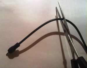 Берем провод и отрезаем его на 7-10 сантиметров дальше штекера. Если нарушения контакта в месте присоединения к штекеру не будет, мы соединим провод в месте разреза. Поэтому нельзя отрезать провод в месте присоединения к штекеру, то есть необходимо оставить небольшой кусок для возможности соединения проводов пайкой.