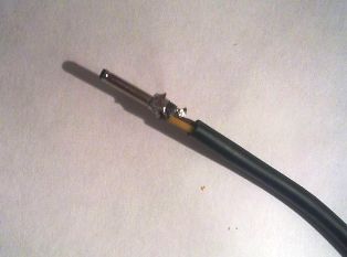 Для этого зачищаем провода, которые идут от штекера, вставляем тонкую проволочку во внутрь штекера (это необходимо для контакта с внутренней контактной частью штекера).