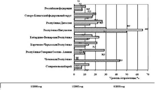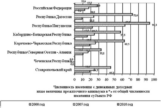 Рисунок 2. Изменение численности населения с денежными доходами ниже величины прожиточного минимума в субъектах Северо-Кавказского федерального округа в период с 2000 по 2010 годы, в % [1, с. 168-169]