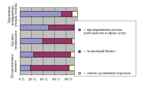 Заметна разница с женщинами-пред- принимателями, имеющими среднее образование. Они заняты в основном челночным бизнесом, содержат места в торговых центрах, имеют магазины смешанных товаров.