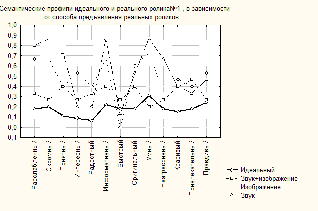 В то же время по некоторым оцениваемым шкалам (например, интересный - скучный, радостный – грустный, быстрый – медленный), средние значения по способу предъявления только звукового ряда получают наиболее близкие оценки к профилю идеального ролика. В целом разброс значений по всем вариантам предъявления ролика №1 достаточно большой (см. приложение 3).