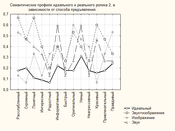 Анализируя график оценок потребителей ролика №1 по методике семантического дифференциала. Мы наблюдаем следующую картину: средние значения ближе всего к идеальному при предъявлении ролика способом включающем в себя все три компонента телевизионного рекламного сообщения вербальный текст, звуковой ряд и визуальный ряд. Тогда как вариант предъявления рекламного сообщения, в котором исключен один из компонентов – звуковой или визуальный ряд – в своих пиковых значениях на графике, различается от идеального по средним значениям в наибольшей степени.
