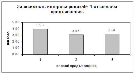 Следует также отметить, что по шкалам интерес и значимость (3,93 и 4,00 соответственно), при оценках идеального ролика (4,42 и 4,04) наибольшие оценки были получены для ролика №1, при использовании способа предъявления, включающем в себя все три компонента телевизионного рекламного сообщения. Это наибольшая величина по шкалам интерес и значимость, полученная в ходе всего исследования.