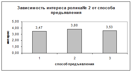 Следует также отметить, что по шкалам интерес и значимость ролик №2 получает оценки очень близкие по всем способам предъявления (около 3 баллов), причем эти оценки практически на балл ниже, чем оценки идеального ролика по тем же шкалам.
